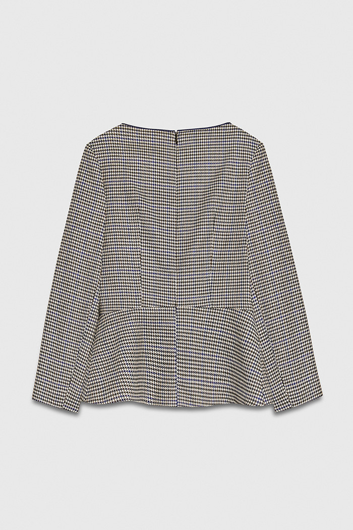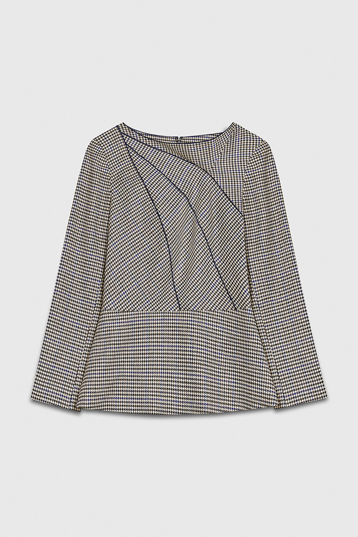 Tailored from a striking houndstooth jacquard, the Abbott top fuses wearable shades of navy, toffee and ivory. An asymmetric slash neckline and subtle peplum hem create a feminine hourglass silhouette. Draped in-house, statement panelling extends asymmetrically across the bodice, embellished with navy babylock edges. Accentuate the contrast detailing by wearing with the navy Ultimate Wool slim-leg trousers.