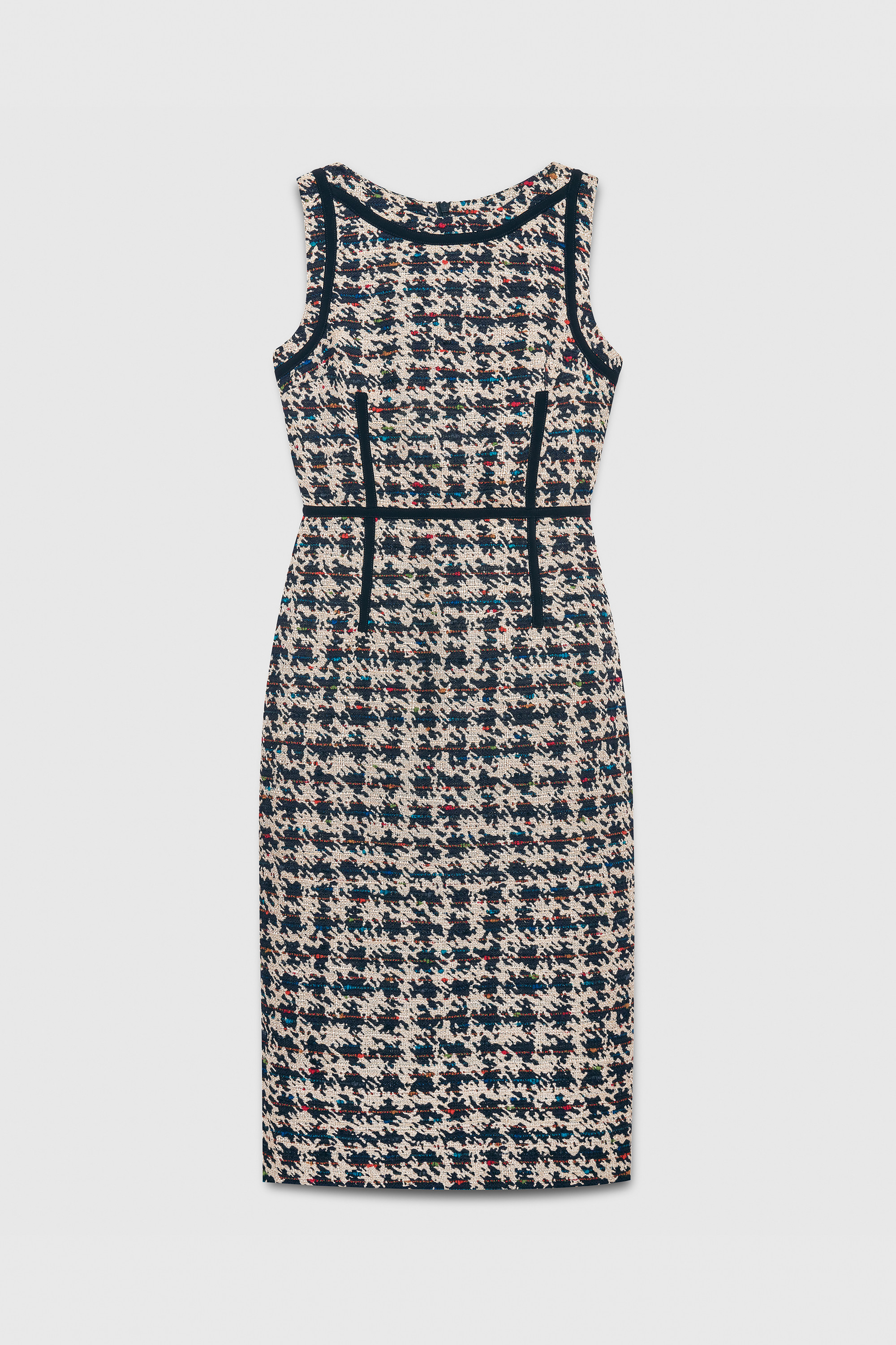 Step boldly into the boardroom in the Corla dress, crafted from a bespoke Italian cotton wool-blend tweed that’s durable enough for years of wear. The navy and oyster houndstooth design is made modern with flecks of multicoloured bouclé, while navy tipping contours the waist and defines the neckline and sleeves. Cut for a slim fit, the pencil silhouette finishes at an effortless below-knee length. Wear with the matching Corla jacket for a statement look that projects unquestionable confidence.