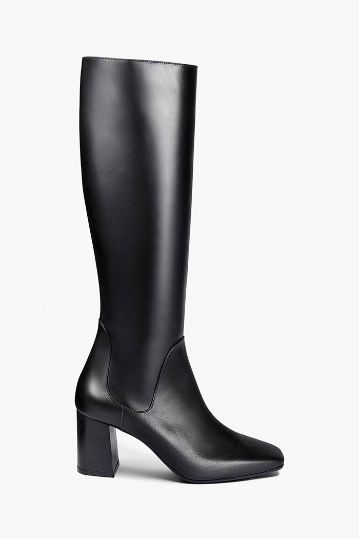 Our black Modena boot is the key to easy autumn outfitting. Sitting just below knee, the sleek silhouette is finished with a modern square toe, inside zip and a 70mm wooden block heel – manageable enough for all-day wear. A gel insert at the heel and foam padding beneath the ball of the foot ensures maximum comfort. Crafted from smooth black leather, they style beautifully with just about anything in your wardrobe.